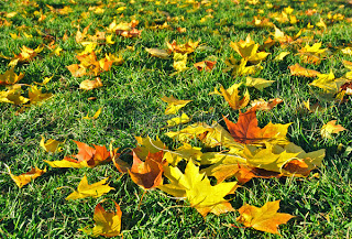 опавшие жёлтые кленовые листья с ещё зелёной травы граблями